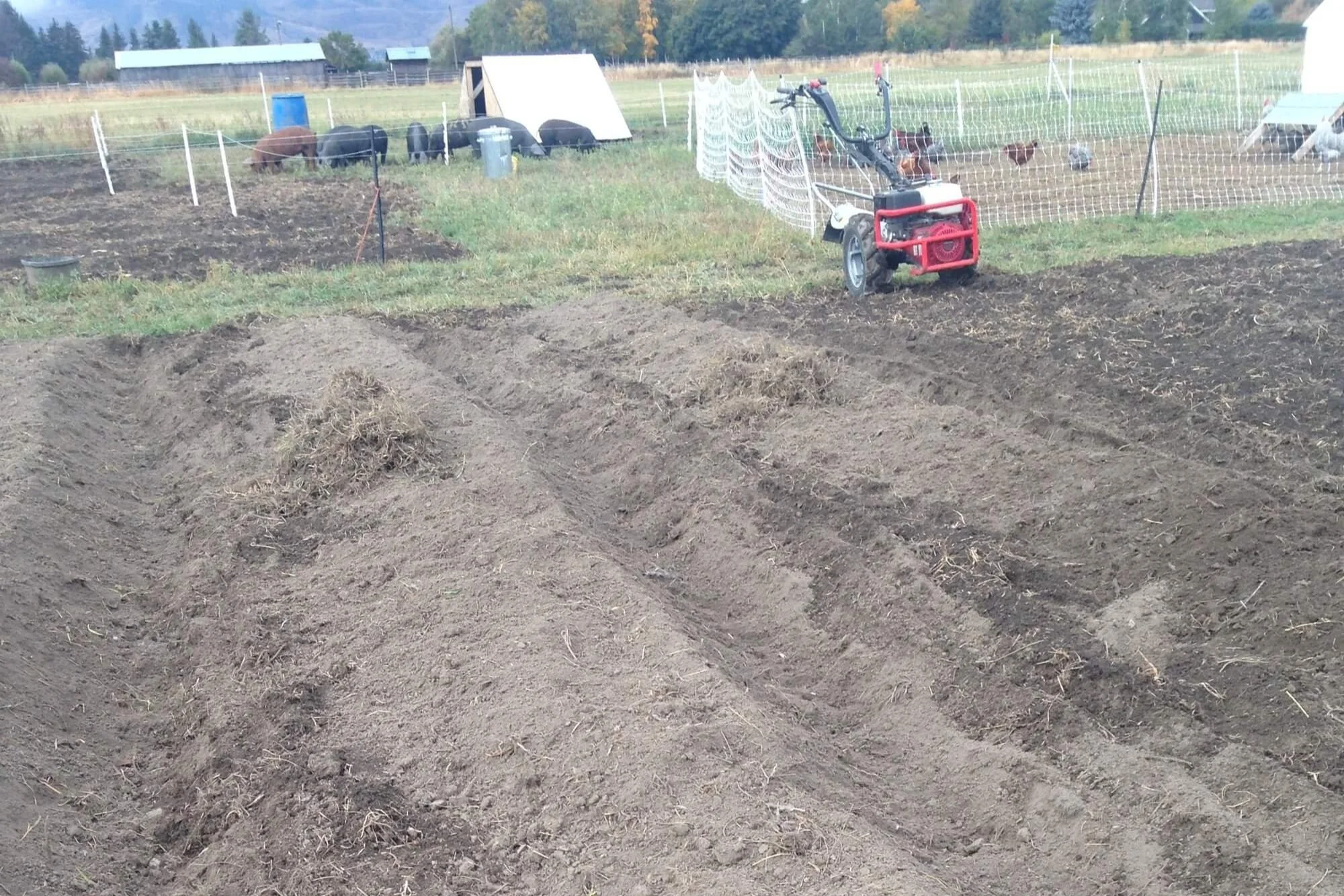 We use a BCS with a rotary plow to help remove the final grass and deep alfalfa roots remaining. This is the first and last time soil is turned.