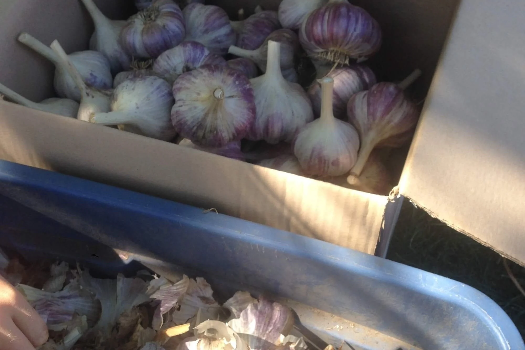 The rotary plow is also used to make raised beds. A manual bed roller with dibbles mark the appropriate spacing and garlic cloves are planted